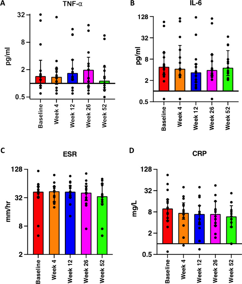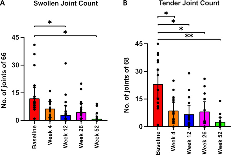 腫脹和壓痛關節評分(根據ACR66/68關節評估測量)在隨訪結束時顯示與基線相比在第52周有顯著改善,中位數從12.0 (IQR 8.0–19.0) 下降到1 (IQR 0.0) –3.0) 用于腫脹關節,20.0 (IQR11.0–36.0) 至1.0 (IQR0.0–4.0) 用于觸痛關節計數。療效數據分析表明,關節計數的改善具有統計學意義(p=0.003和p=0.0008),并且分別對腫脹和壓痛關節計數具有較大的影響(ES = 0.83 和 ES = 0.93);圖2, 表2)。