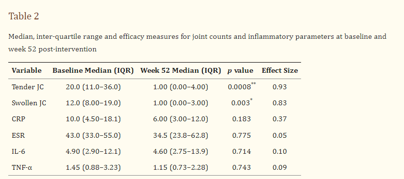 表2:基線和干預后第52周的關節計數和炎癥參數的中位數、四分位間距和療效測量。