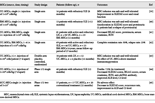 然而,在一項針對新診斷的嚴重LN的同種異體UC-MSC隨機雙盲、安慰劑對照試驗中,Deng等人得出的結論是,MSC沒有超過標準免疫抑制的明顯額外效果,因為他們觀察到,接受UC-MSC和安慰劑的患者中有相似比例的患者獲得了完全緩解。兩組的血清白蛋白、補體、腎功能、SLEDAI和BILAG評分的改善相似。