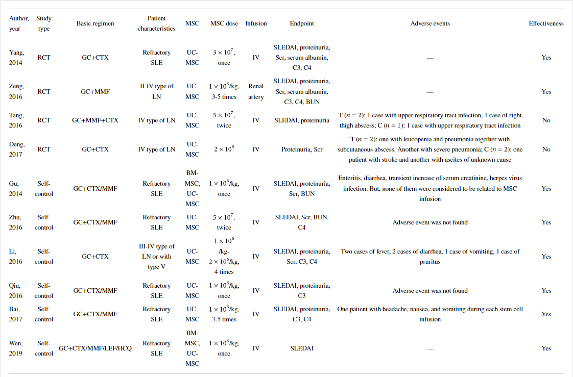 結果:在RCT中,結果表明MSC組在3個月和6個月時的蛋白尿低于對照組,MSC組在2個月和6個月時顯示出低于對照組的 SLEDAI。此外,, 95% CI: 0.07, 0.89,). 在病例系列試驗中,結果表明MSC組在1個月、2個月、3個月、4個月、6個月和12個月時蛋白尿較低??傊g充質干細胞可能是SLE患者有前途的治療藥物。