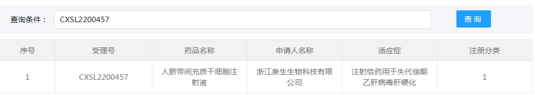 ▉ 干細胞藥物新增默示許可依據(jù)2023年1月2日,CDE官網(wǎng)顯示,浙江泉生生物科技有限公司的“人臍帶間充質(zhì)干細胞注射液”(受理號:CXSL2200457)獲得新藥臨床試驗?zāi)驹S可,適應(yīng)證為:注射給藥用于失代償期乙肝病毒肝硬化。這是該干細胞注射液的第四種適應(yīng)證,此前已獲得默示許可用于注射給藥輕至中度急性呼吸窘迫綜合征(受理號:CXSL2200114)、強直性脊柱炎(受理號:CXSL2200299)、Ⅱ度燒傷(受理號:CXSL2200301)的臨床試驗。